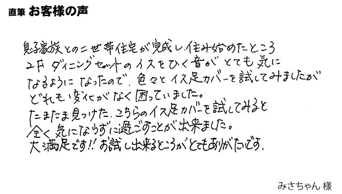 イスを動かす音は、一度気になるとなんとかしたくなるんですよね。無事にお悩みが解決できて良かったです^ ^